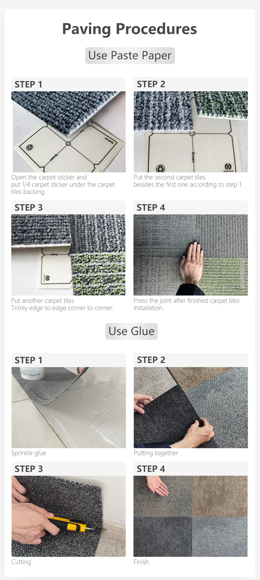 All JUDONG Carpet Tiles should be inspected carefully for dye lot, pattern, quality and other damage